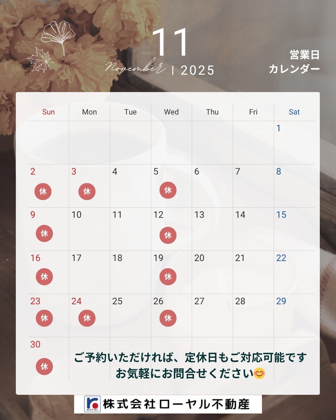 11月の営業日のお知らせです🤗