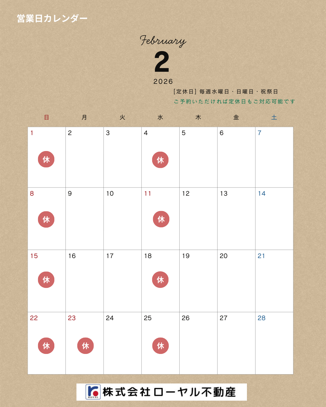 2月の営業日のお知らせです🤗