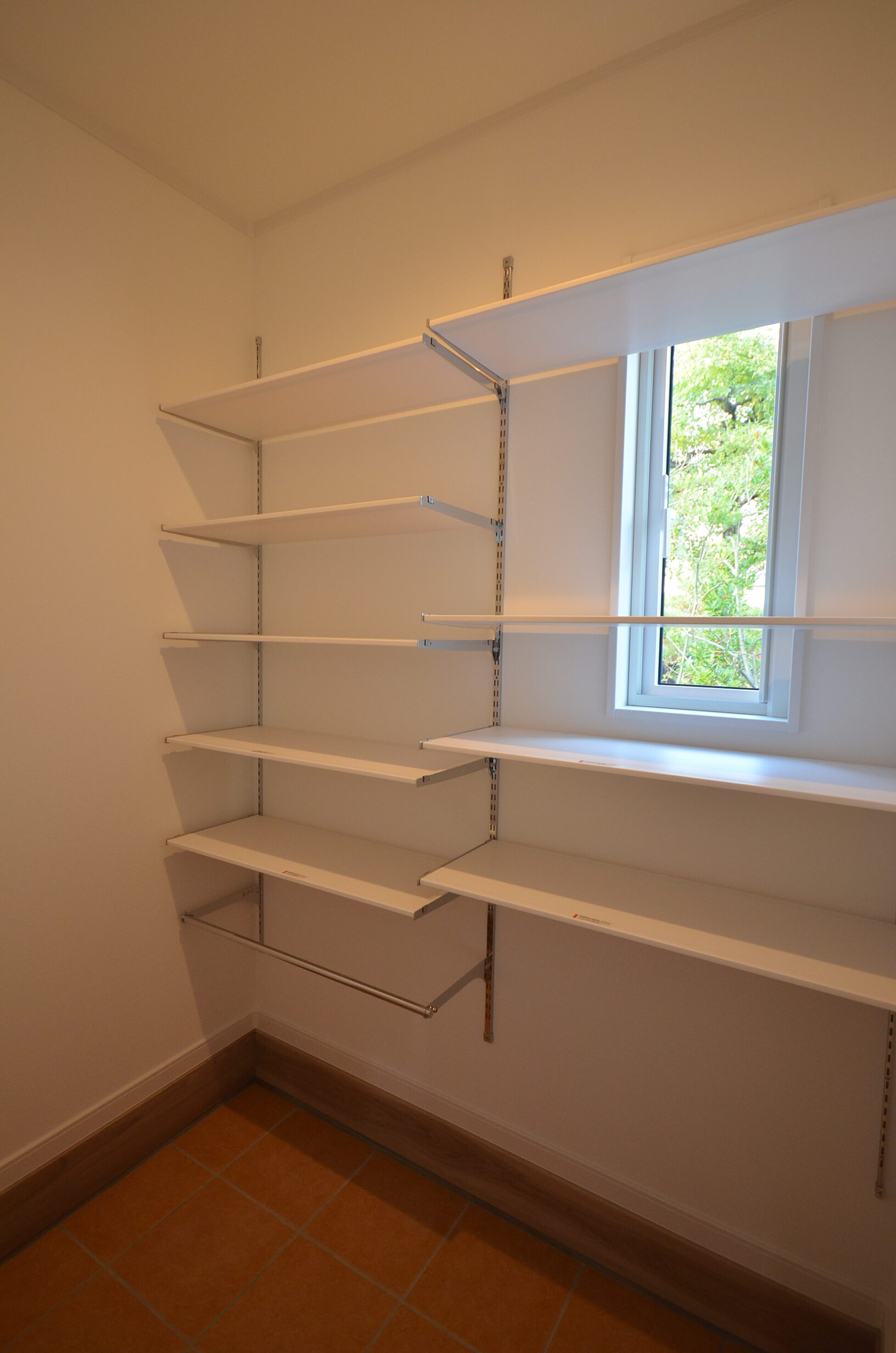 玄関を入ると大容量の収納スペース。収納棚には可動棚を設けており、高さを変えられるのでブーツなども便利に収納できます。