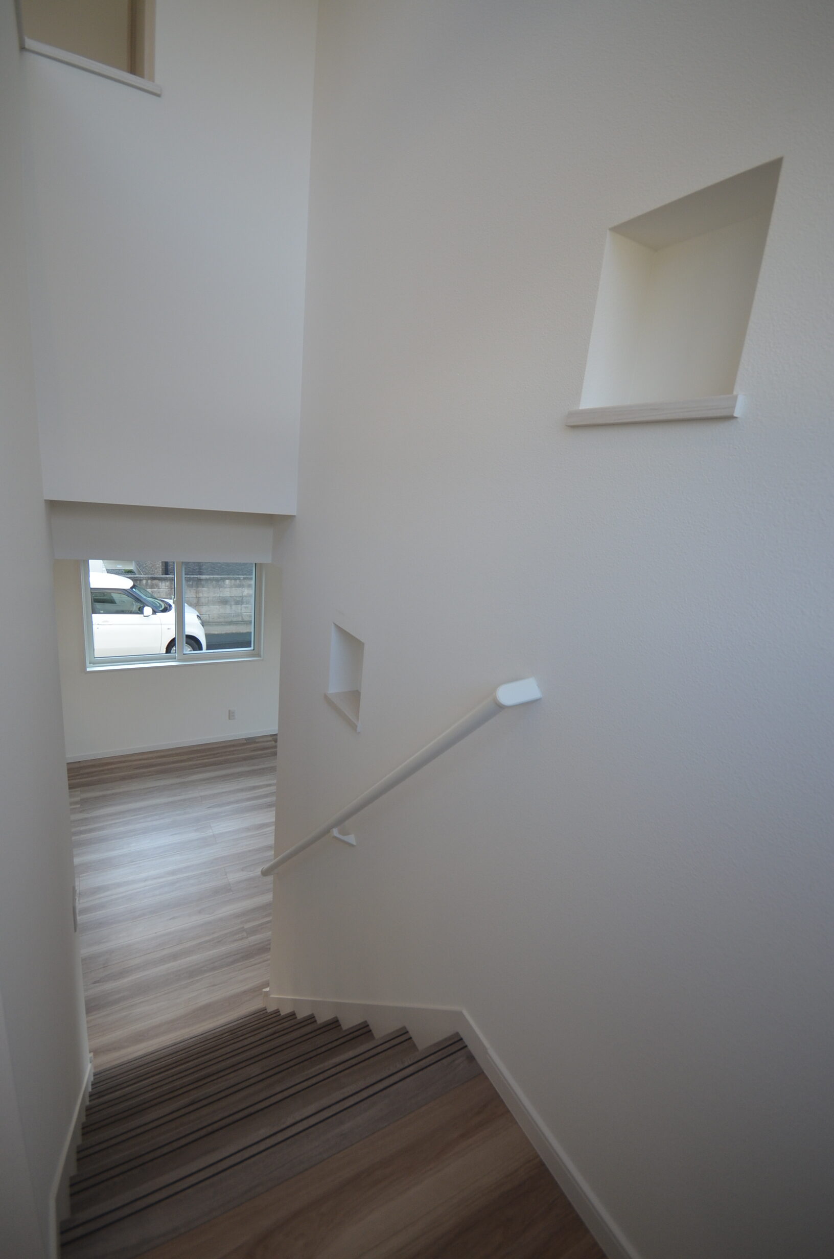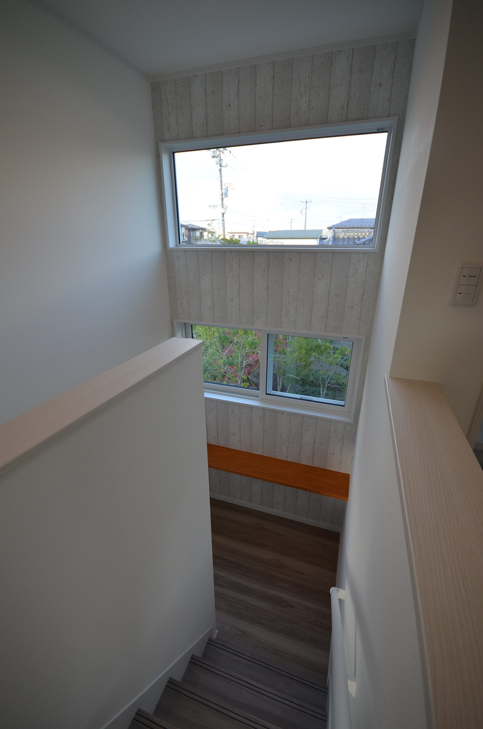 リビングから続く階段。踊り場には大きな窓を設け、開放的なスペースに。造作カウンターを設けお気に入りの本を置いたり、ちょっとした趣味のスペースにも最適です。
