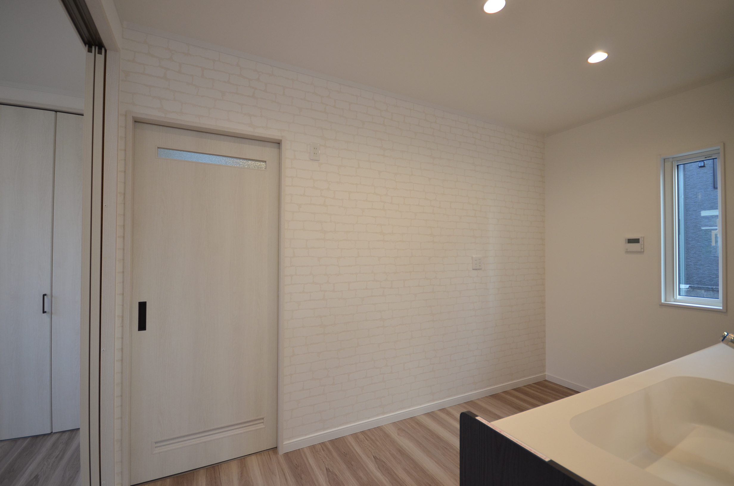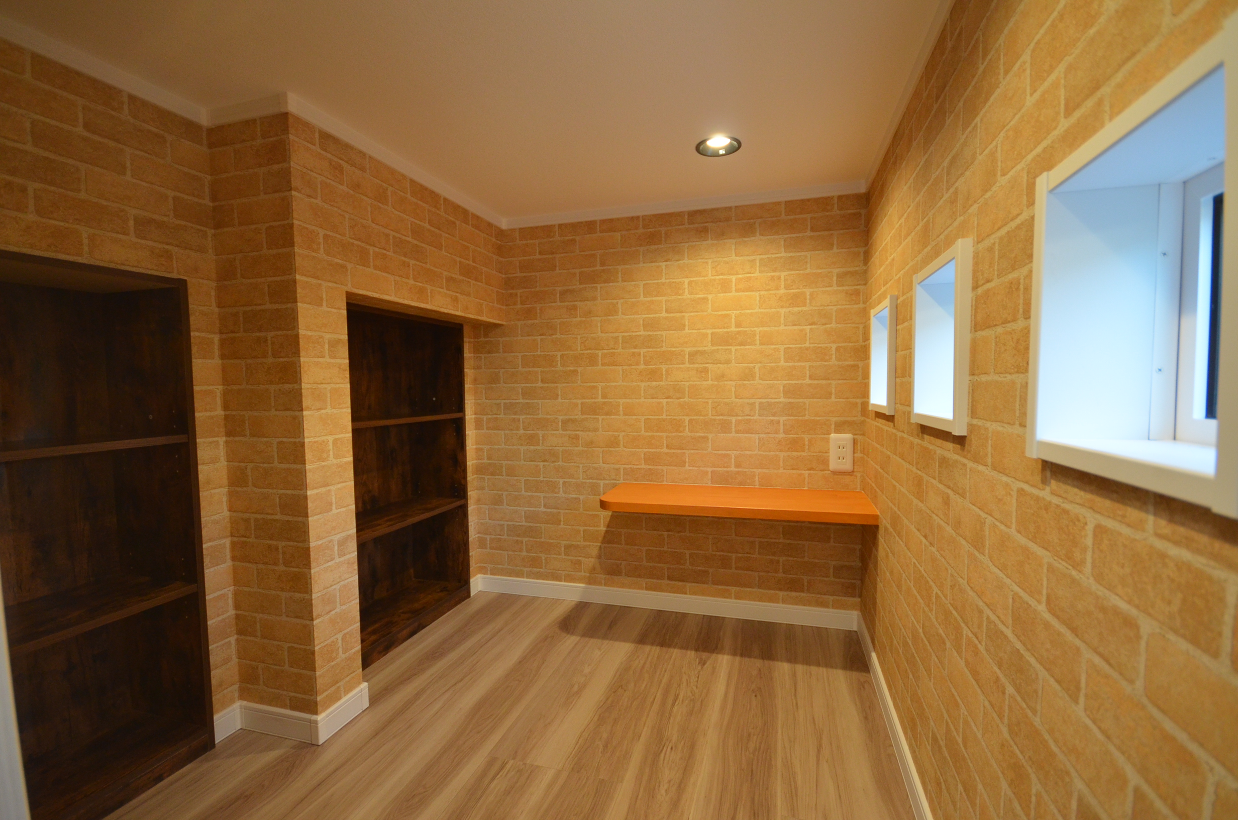 レンガ調タイルのクロスで設えており、好きな本や趣味の物などを置ける棚収納や造作カウンターも設置しました。自分だけの秘密の部屋としても◎ 楽しさも広がります。