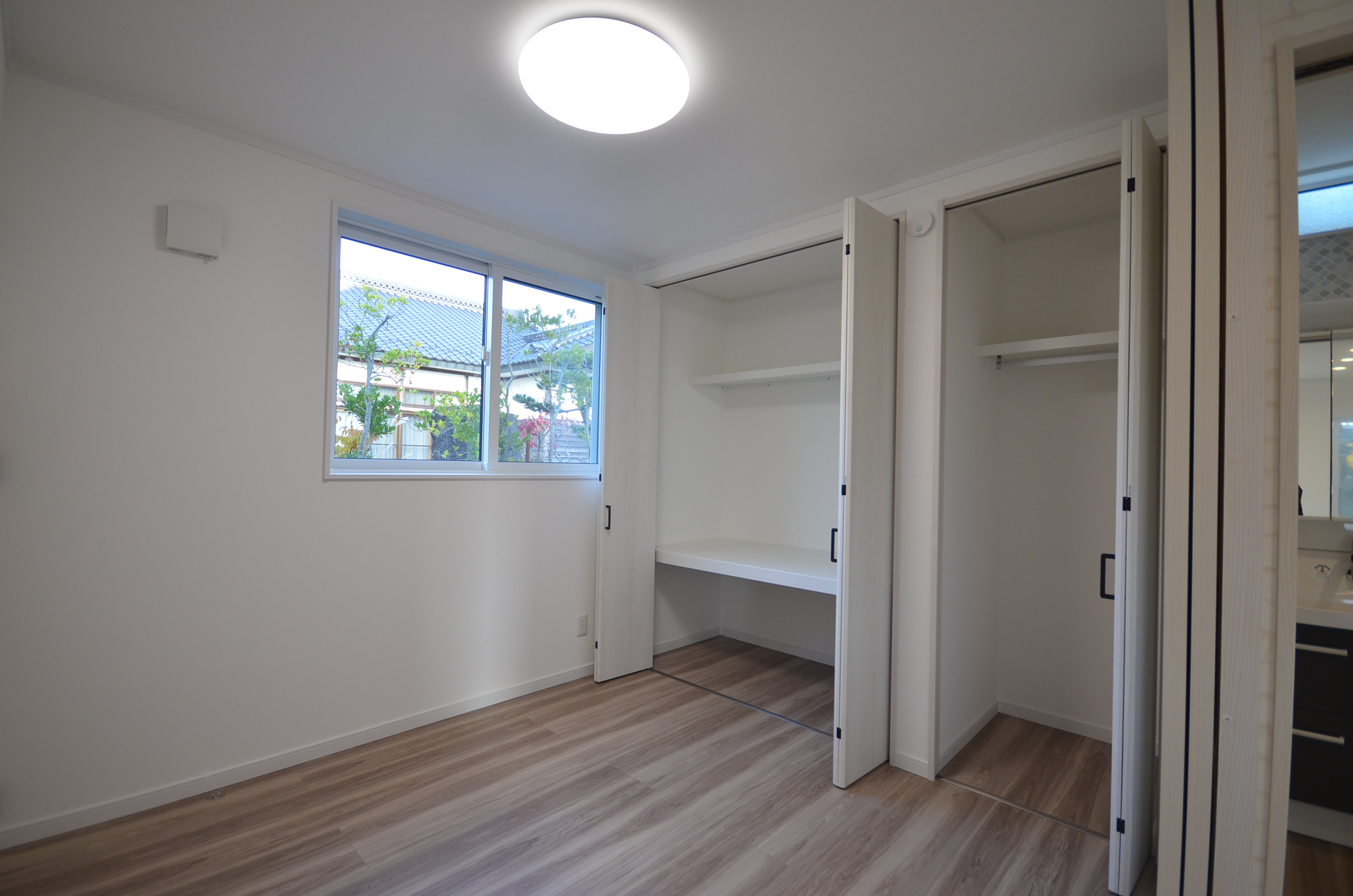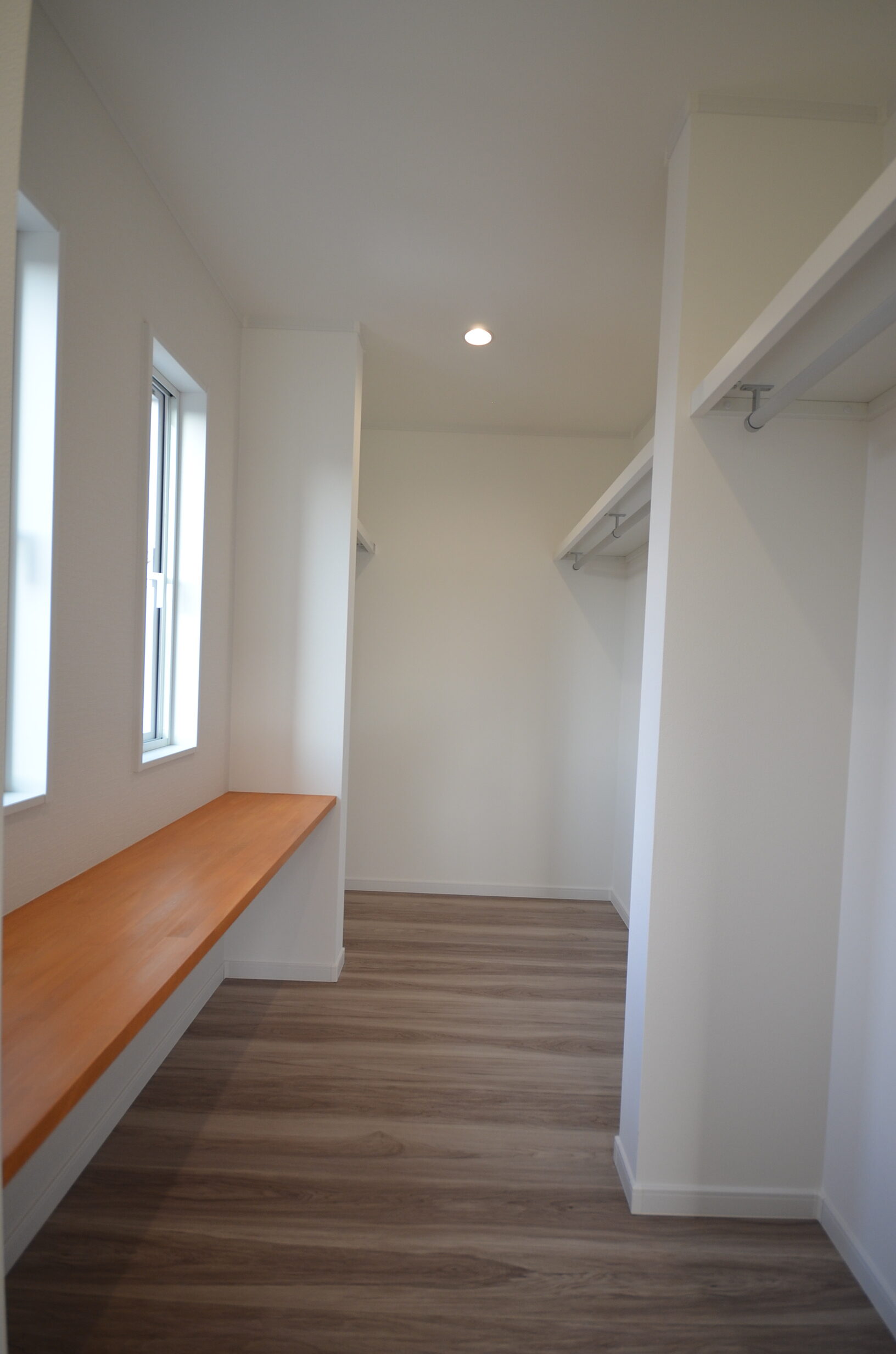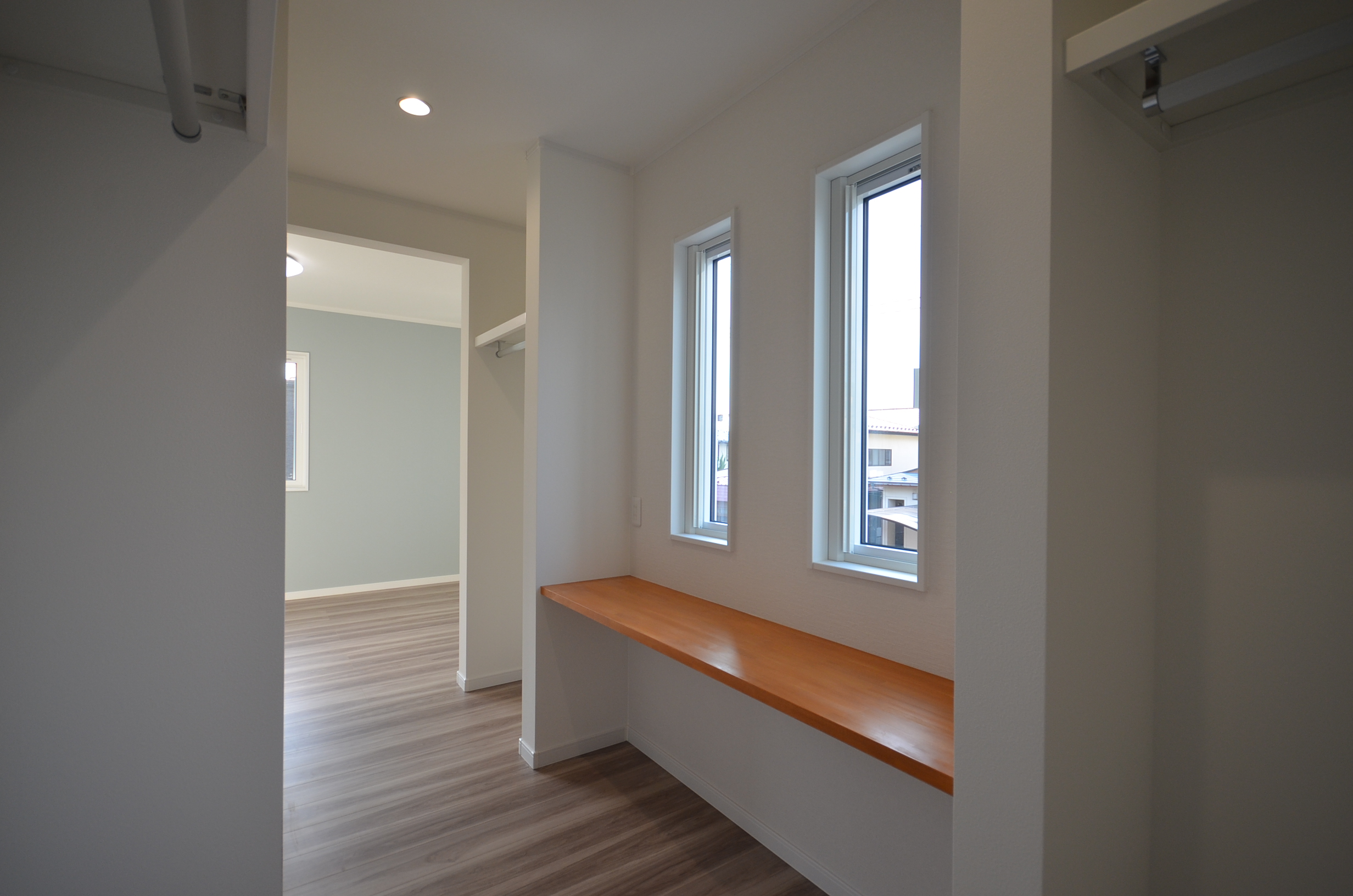 主寝室のウォークインクローゼット4.0帖です。カウンターも設置しており、洋服だけでなく、小物類の収納にも便利です。