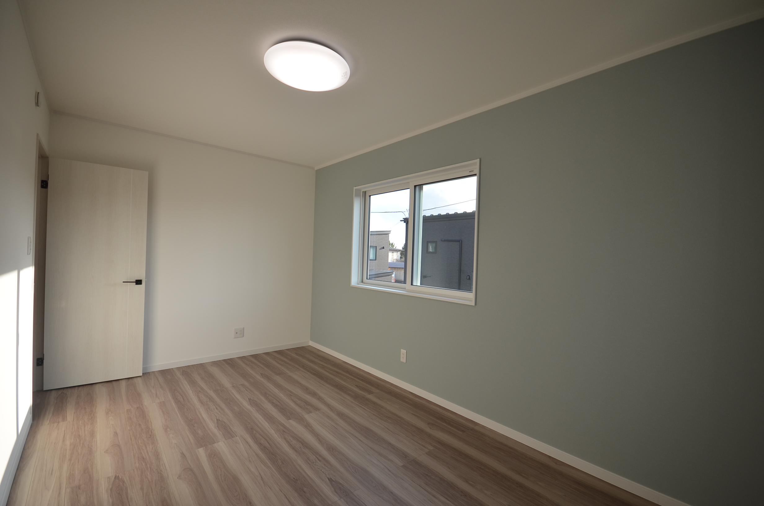 主寝室は淡いブルーグリーンのクロスで落ち着いた雰囲気の空間になっています。
